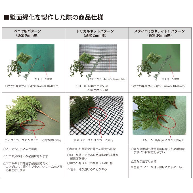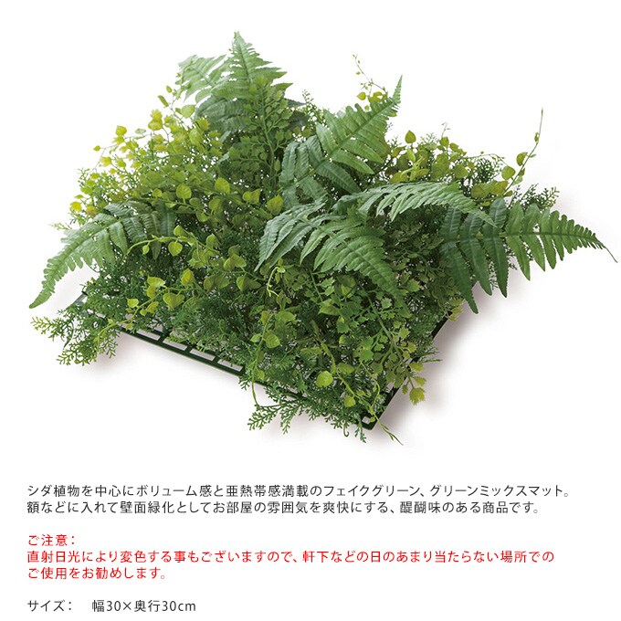 備考:シダ植物を中心にボリューム感と亜熱帯感満載のフェイクグリーン、グリーンミックスマット。額などに入れて壁面緑化としてお部屋の雰囲気を爽快にする、醍醐味のある商品です。