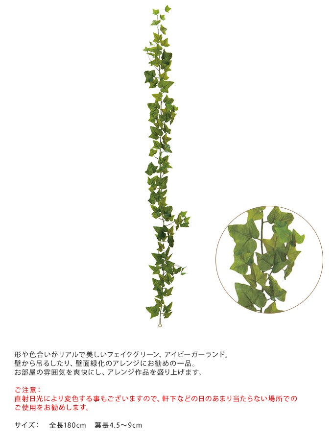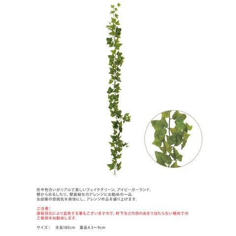 備考:形や色合いがリアルで美しいフェイクグリーン、アイビーガーランド。壁から吊るしたり、壁面緑化のアレンジにお勧めの一品。お部屋の雰囲気を爽快にし、アレンジ作品を盛り上げます。