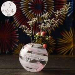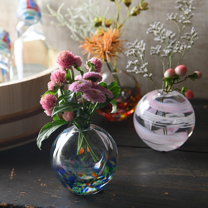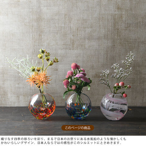 備考:日本製、日本のガラス工場で作られた確かな技術のガラス一輪挿し花瓶。織りなす四季の移ろいを彩り、まるで日本のお祭りにある水風船のような懐かしくもかわいらしいデザイン。日本人ならではの感性がこのシルエットにときめきます。ちょこっと、窓辺や玄関、テーブルなどの飾りにおススメです。