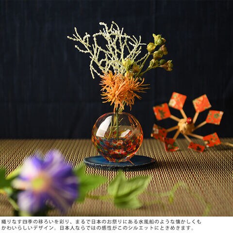 備考:日本製、日本のガラス工場で作られた確かな技術のガラス一輪挿し花瓶。織りなす四季の移ろいを彩り、まるで日本のお祭りにある水風船のような懐かしくもかわいらしいデザイン。日本人ならではの感性がこのシルエットにときめきます。ちょこっと、窓辺や玄関、テーブルなどの飾りにおススメです。