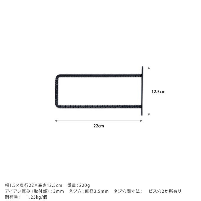 サイズ/重さ:幅1.5×奥行22×高さ12.5cm 重量:220g アイアン厚み(取付部):3mm ネジ穴:直径3.5mm ネジ穴間寸法: ビス穴2か所有り