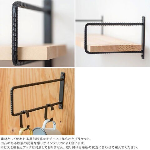 備考:建材として使われる異形鉄筋をモチーフに作られたブラケット。凹凸のある鉄筋の武骨な感じがインテリアによく合います。