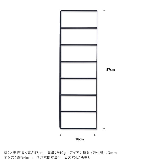 サイズ/重さ:幅2×奥行18×高さ57cm 重量:940g アイアン厚み(取付部):3mm ネジ穴:直径4mm ネジ穴間寸法: ビス穴4か所有り