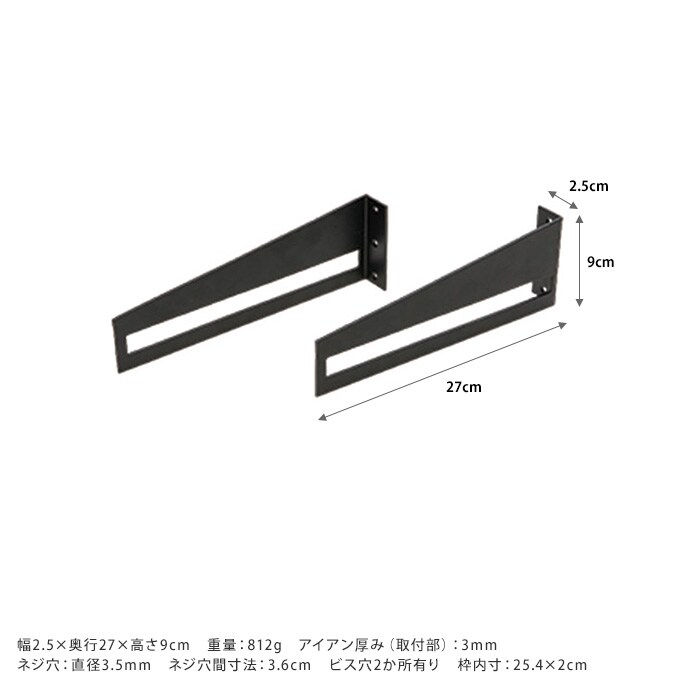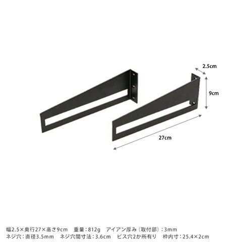 サイズ/重さ:幅2.5×奥行27×高さ9cm 重量:812g アイアン厚み(取付部):3mm ネジ穴:直径3.5mm ネジ穴間寸法:3.6cm ビス穴2か所有り 枠内寸:25.4×2cm