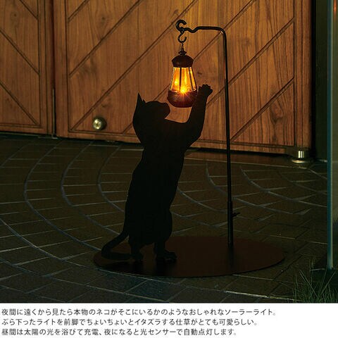 備考:夜間に遠くから見たら本物のネコがそこにいるかのようなおしゃれなソーラーライト。ぶら下ったライトを前脚でちょいちょいとイタズラする仕草がとても可愛らしい。 昼間は太陽の光を浴びて充電、夜になると光センサーで自動点灯します。