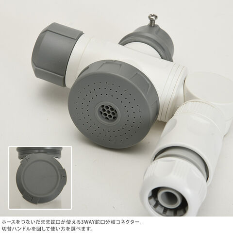 備考:ホースをつないだまま蛇口が使える3WAY蛇口分岐コネクター。切替ハンドルを回して使い方を選べます。手洗いや水汲みに便利な下向きストレート。緩やかな細かい水が出せる下向きシャワー。庭の水やりなどの散水ができる横向きホース。(コネクターは脱着式なのでホースを簡単に外すことも可能です。)※万能水栓に使用してください。