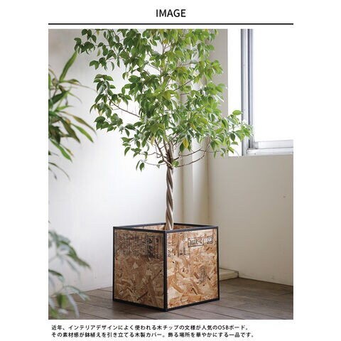 備考:近年、インテリアデザインによく使われる木チップの文様が人気のOSBボード。その素材感が鉢植えを引き立てる木製カバー。飾る場所を華やかにする一品です。