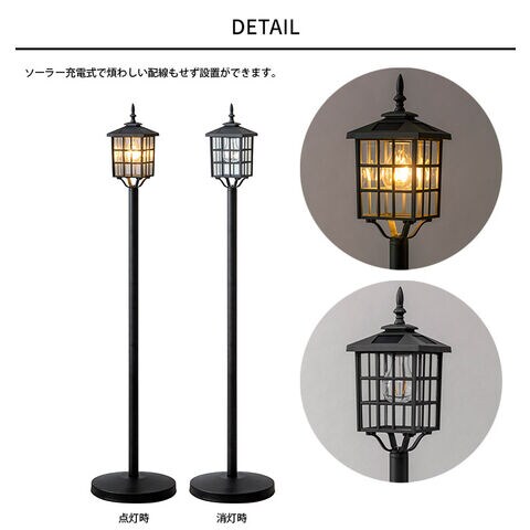 備考:ガス灯のようなおしゃれでアンティーク感のあるポストライト。ソーラー充電式で煩わしい配線もせず設置ができます。組立も簡単。お庭の憩いの場所などに。