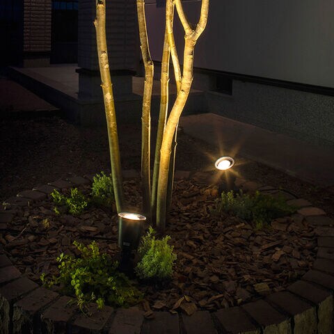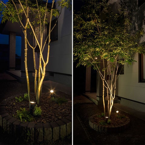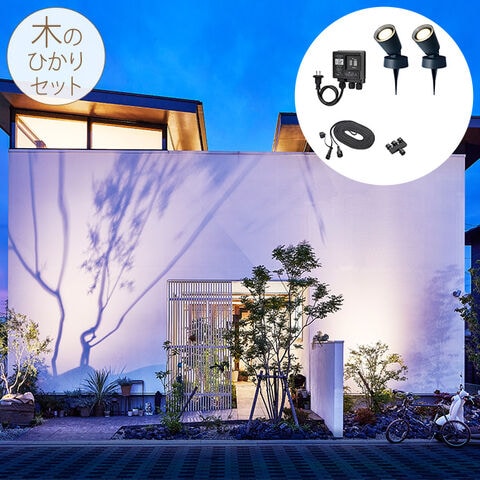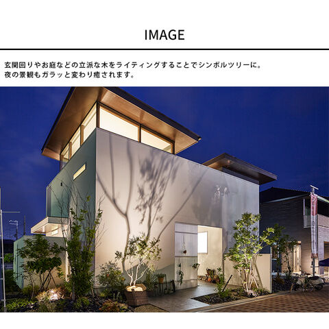 備考:家周りを美しく見せるライティングテクニック!玄関回りやお庭などの立派な木をライティングすることでシンボルツリーに。夜の景観もガラッと変わり癒されます。ライトの照射角度によって影が生み出す奥行感が神秘的なシャドーライティングや壁への照射で輪郭を浮かび上がらせるシルエットライティングを楽しめます。