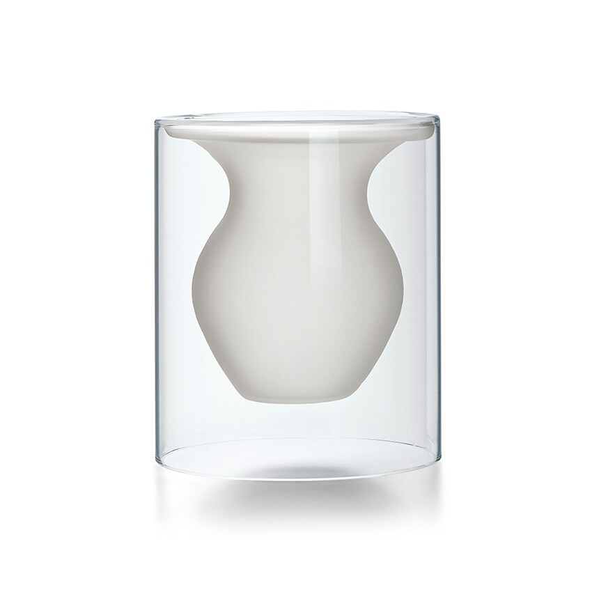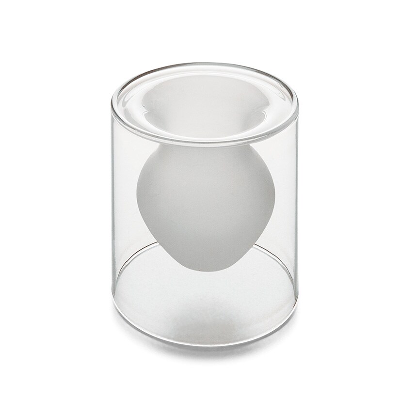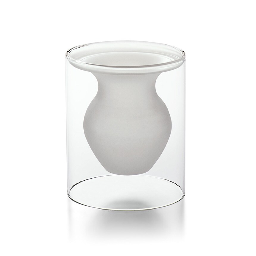 端正な曲線を描くフローティングデザインが印象的。表面はクリアガラス、中にサンドブラスト加工を施したマットガラスが浮遊しています。2重構造デザインが秀逸で、高級感があり、存在感のあるインテリアデコールです。