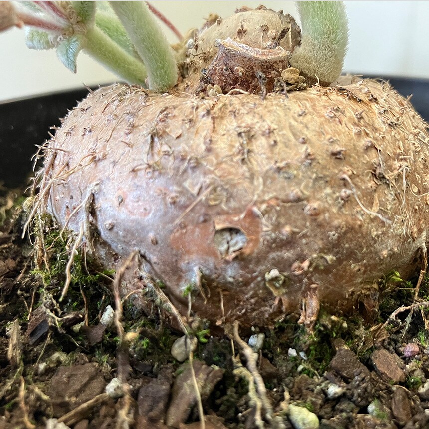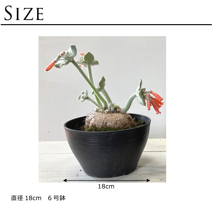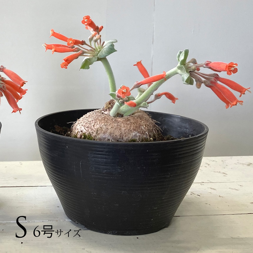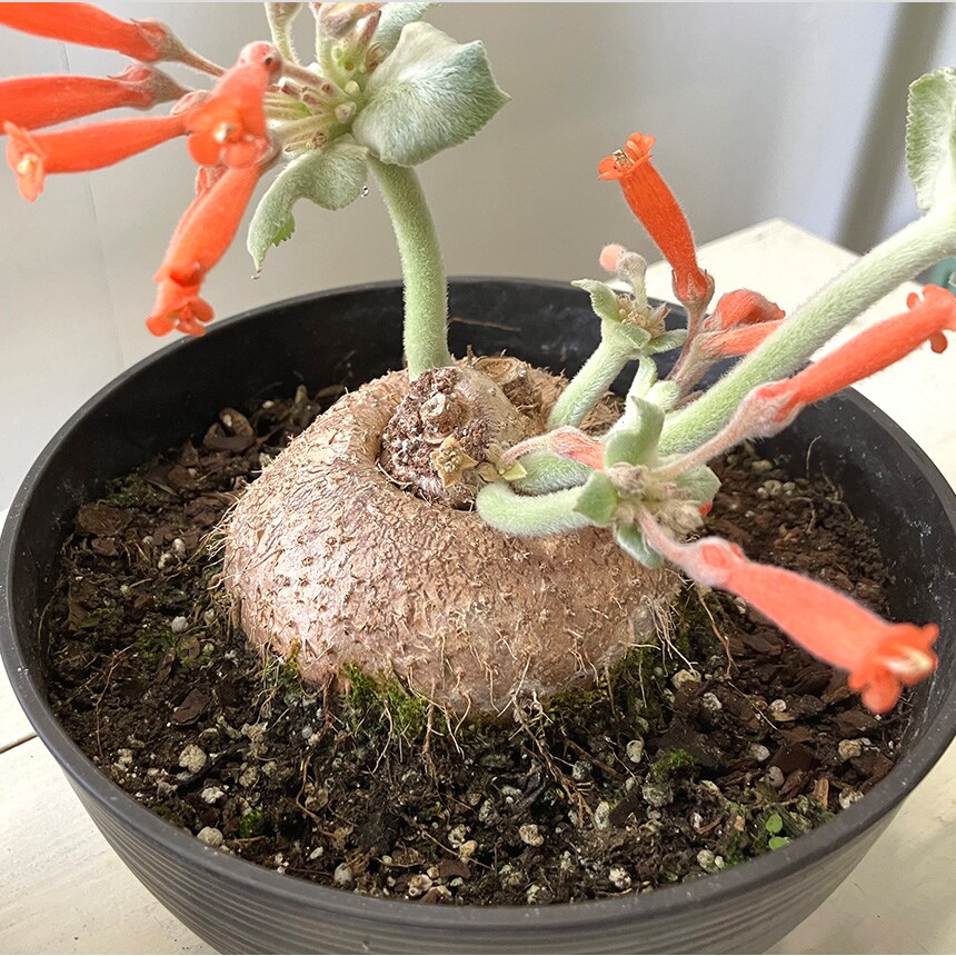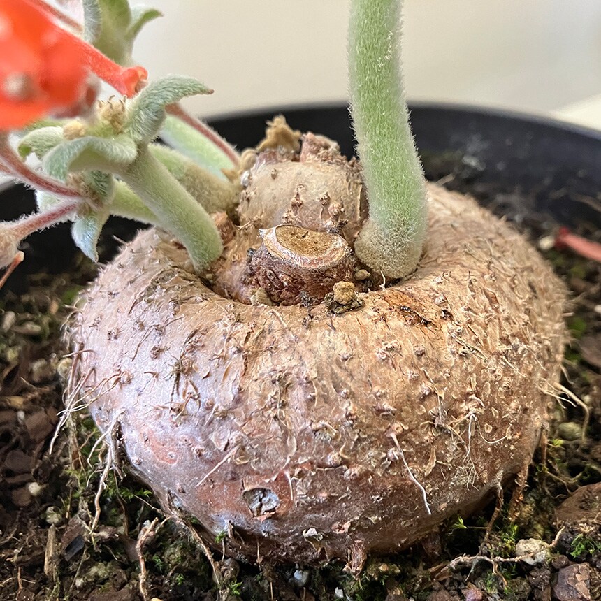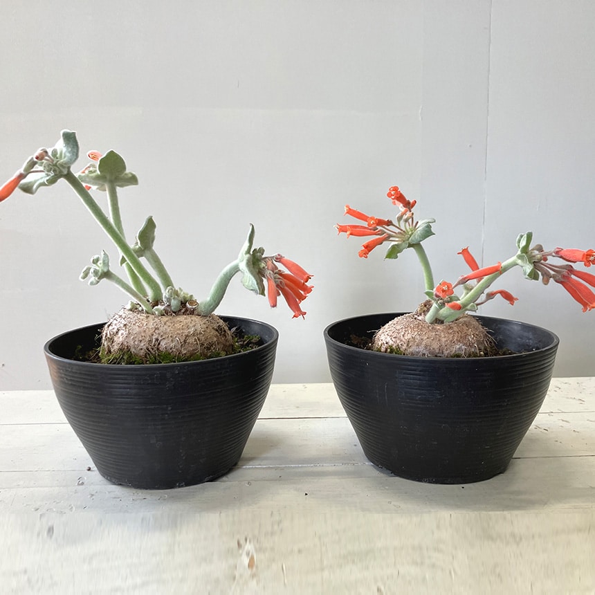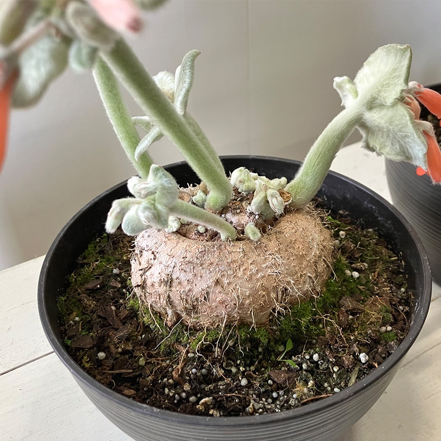 備考:原産地のブラジルでは野生のものが崖にへばりつくように生えている姿から、別名「断崖の女王」とも呼ばれています。 肥大した塊茎から太めの茎を伸ばし、その先に長さ10cmほどの葉を付けます。 葉の表面は銀白色の産毛で覆われており、その頂点から濃いオレンジ色をした筒状の花を咲かせます。 気温が低くなってくると休眠期に入り、落葉して塊茎の状態になり10度を下回ると休眠期に入るため水やりは控えめにします。 通年の置き場所として直射日光の当たる場所での管理は避けてください。