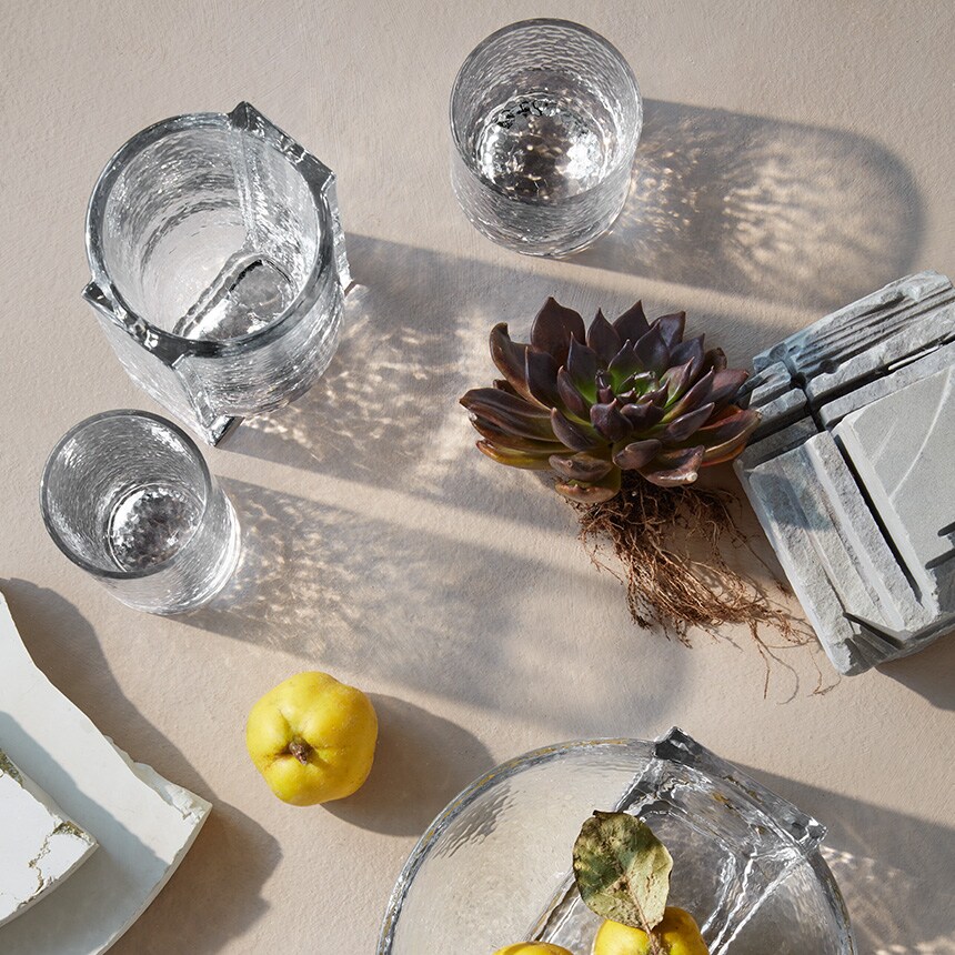 機能がありながらも重量感のあるソリッドガラスや 無機質にも移る鏡面の朧げな幾何学模様から生じる有機的なコントラストは 彫刻的な美しさを併せ持ち、心を刺激してくれます。
