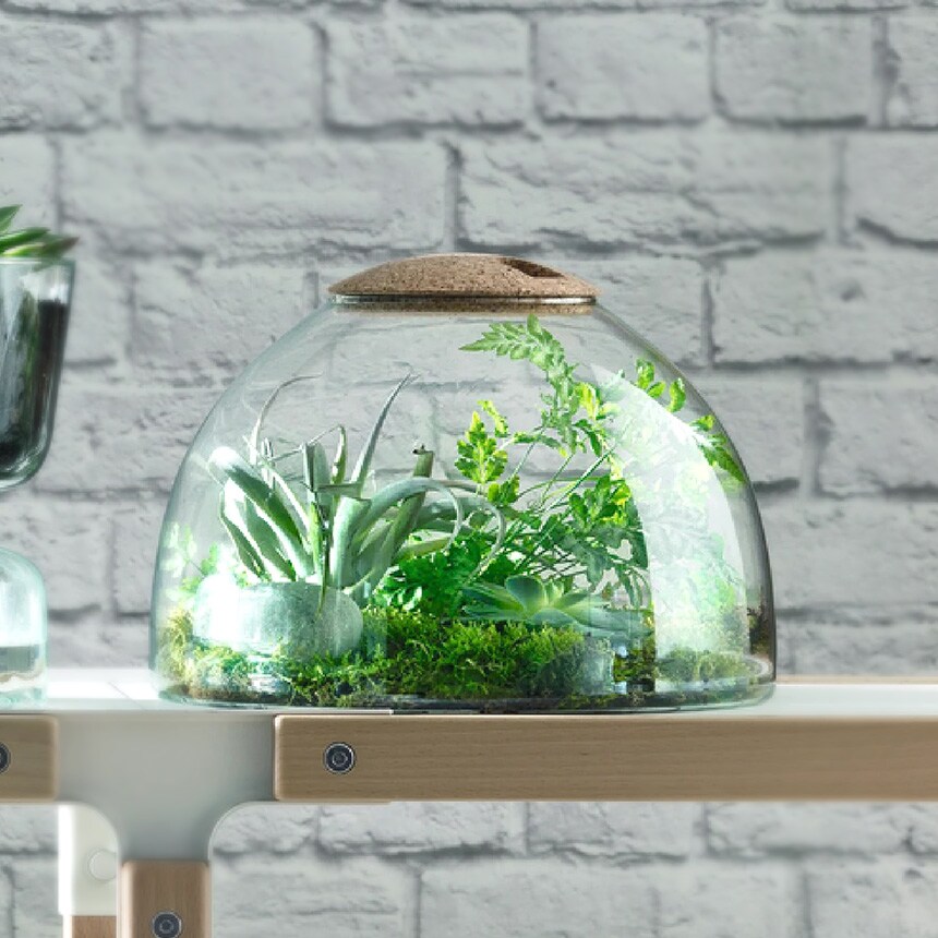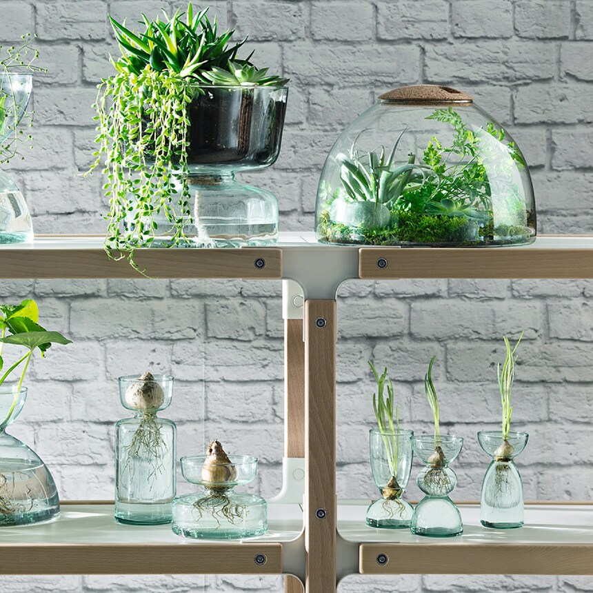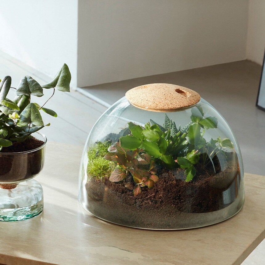 100%再資源化可能なリサイクルガラスと持続可能性あるコルク製の蓋(取外し可能)を使用しているサステナブルなプランターです。