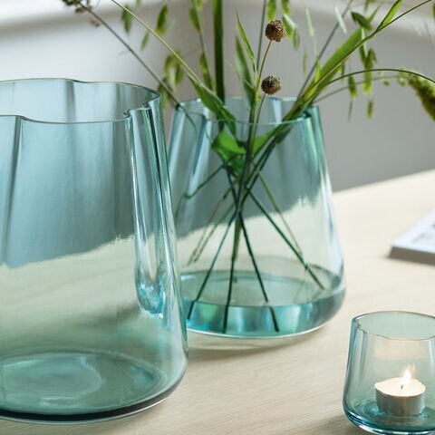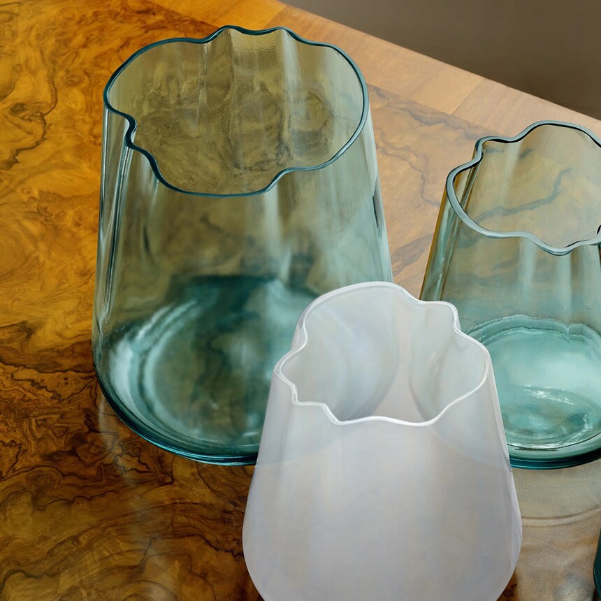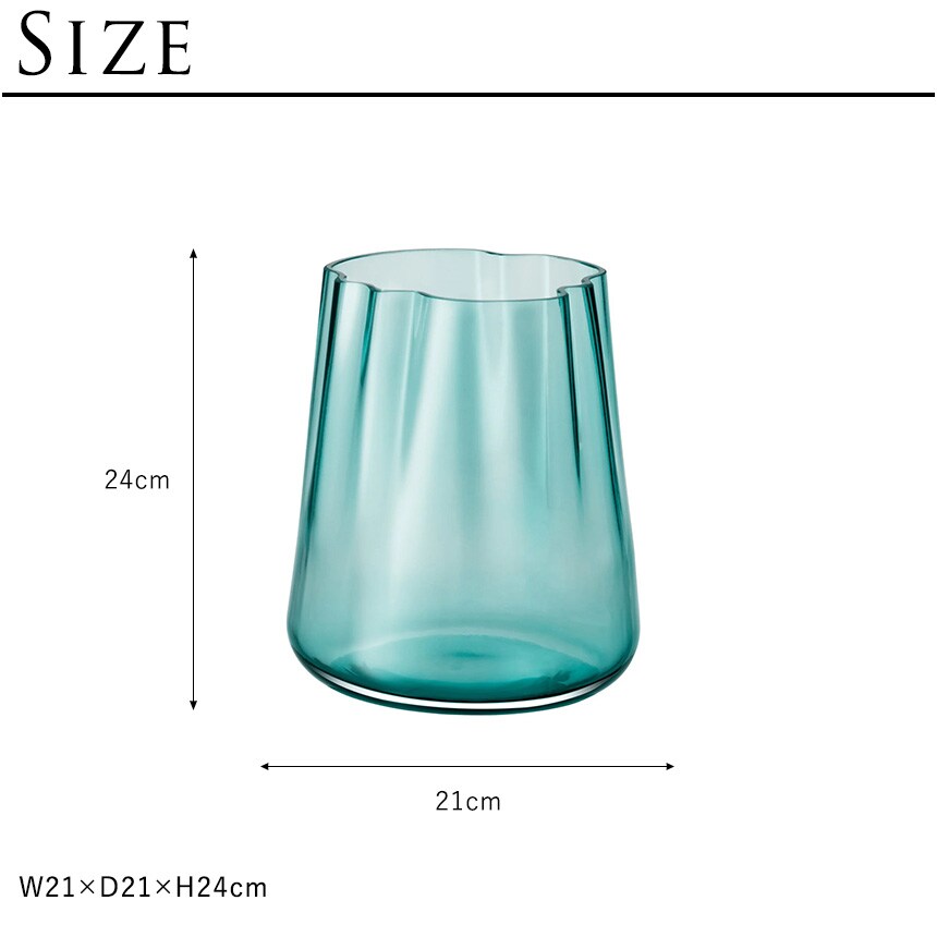 備考:ラグーンを思わせる有機的なフォルムの花瓶・キャンドルホルダー 熟練の吹きガラス職人が特別な金型で成形したフラワーベースです。色に深みを出すために、乳白色とシーグリーン色のガラスを透明ガラスで挟んでマウスブローしています。 緩やかに波打つガラスに花を無造作にアレンジしてお楽しみください。 またキャンドル(別売)を入れて火を灯すと、波間に差し込む光のような炎のゆらめきを感じられます。
