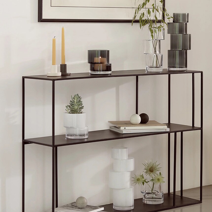 備考:ポストモダン建築を彷彿とさせる吹きガラスの花瓶 幾何学的フォルムの重なり合う、ポストモダン建築にインスパイアされて誕生した手吹きガラスの花瓶です。 彫刻作品さながらの連鎖するフォルムで、ランタンとしてもお使いいただけます。またそのまま飾るだけでもアートピースとして存在感を放ちます。
