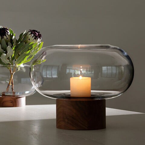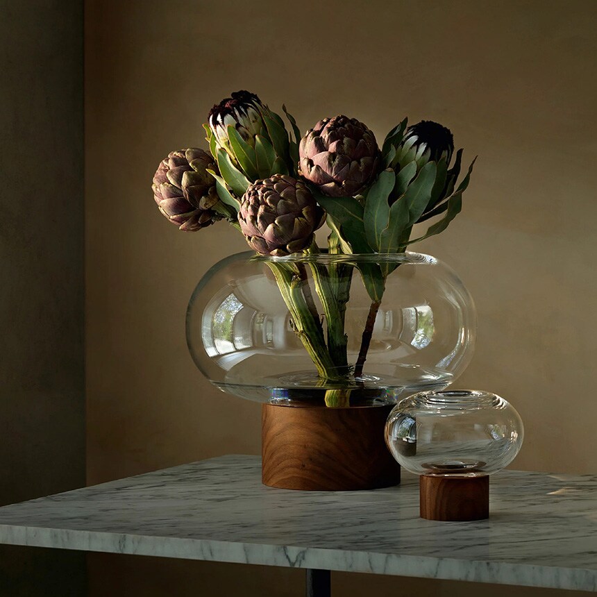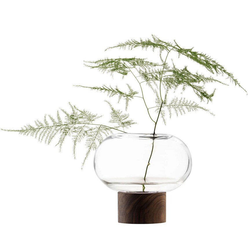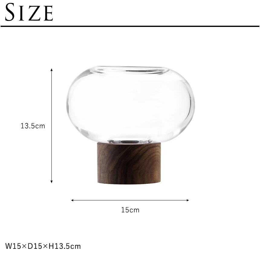ウォールナット材のベースに据えられた、横広がりのボール型花器。すっきりとしたフォルムの吹きガラスとブラックウォールナット材の有機的な杢目がコントラストを織りなします。