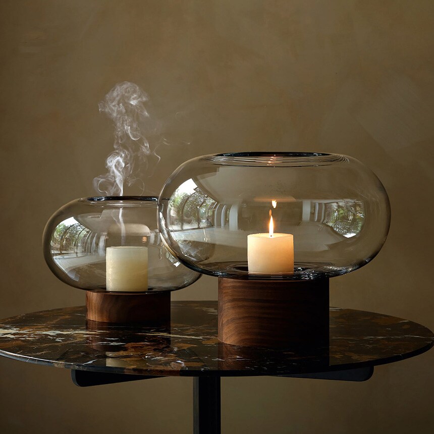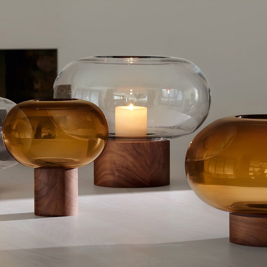 すっきりとしたフォルムの吹きガラスとブラックウォールナット材の有機的な杢目がコントラストを織りなします。