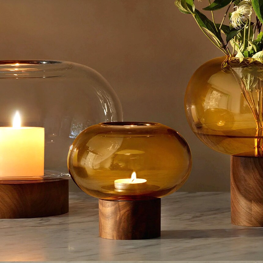 すっきりとしたフォルムの吹きガラスとブラックウォールナット材の有機的な杢目がコントラストを織りなします。