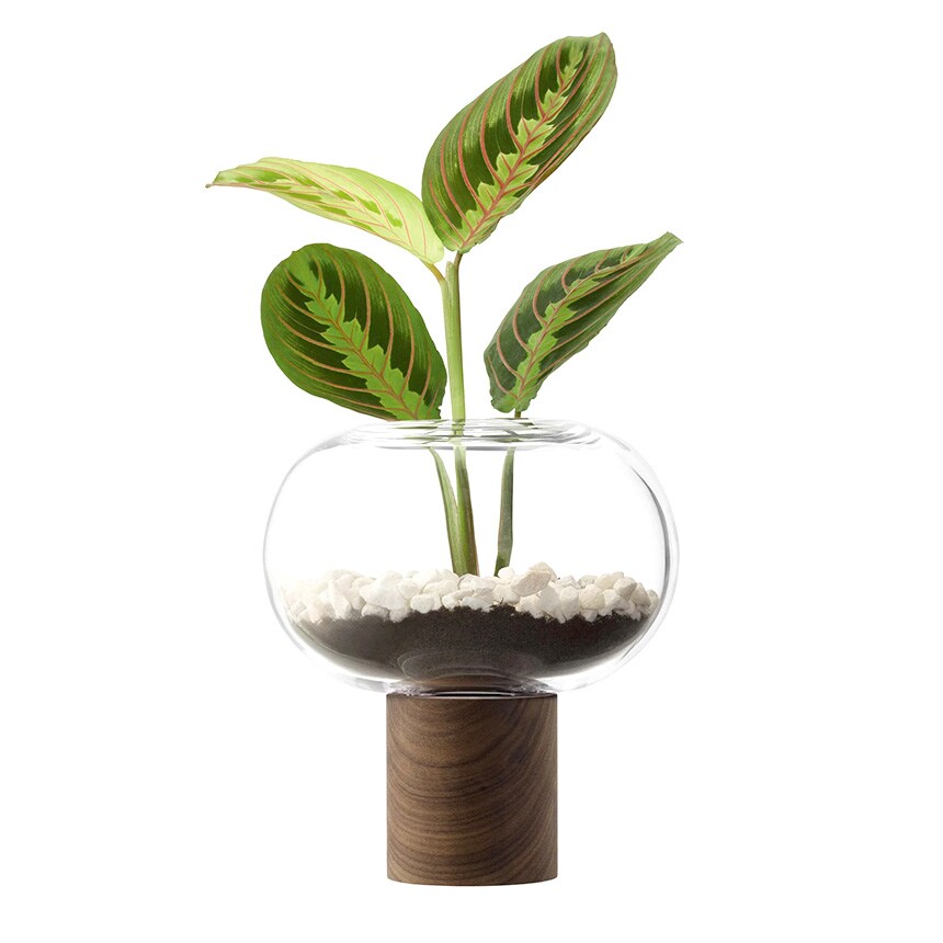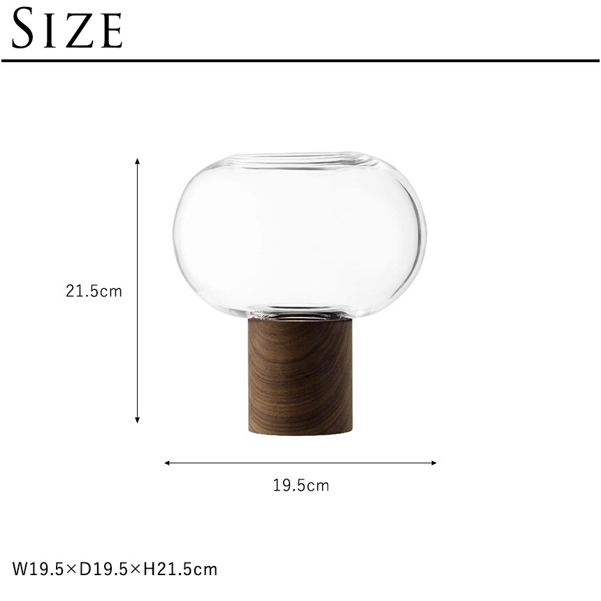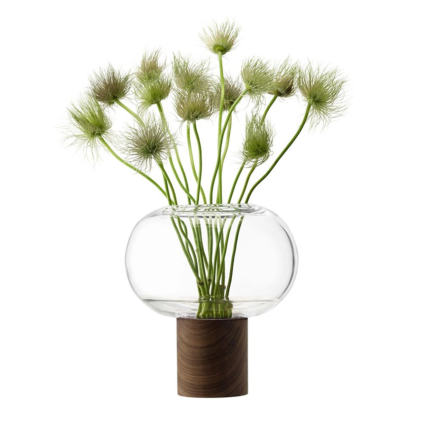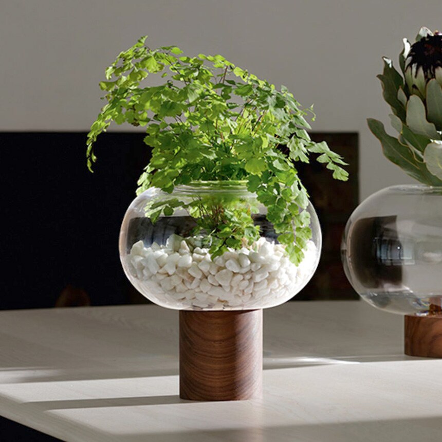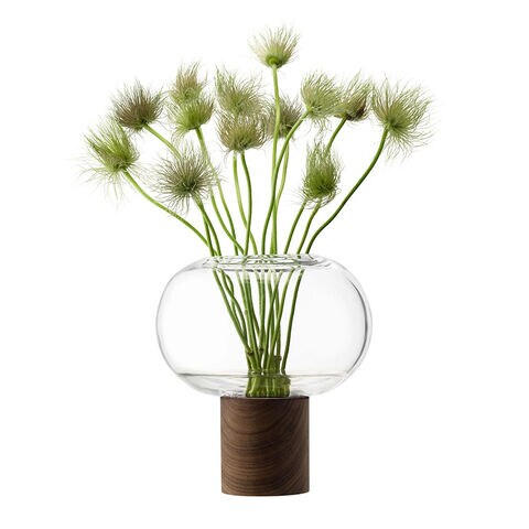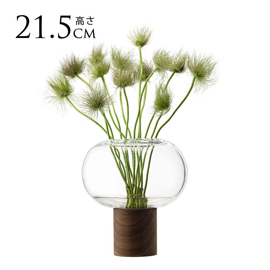 ウォールナット材のベースに据えられた、横広がりのボール型花器。すっきりとしたフォルムの吹きガラスとブラックウォールナット材の有機的な杢目がコントラストを織りなします。