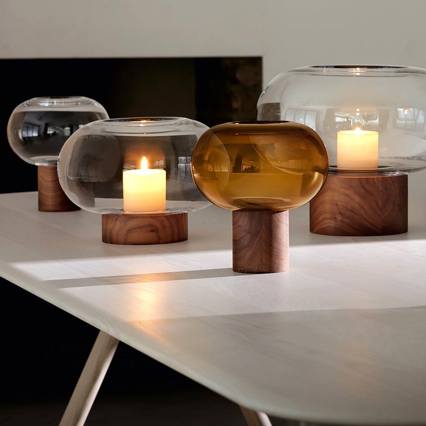 すっきりとしたフォルムの吹きガラスとブラックウォールナット材の有機的な杢目がコントラストを織りなします。