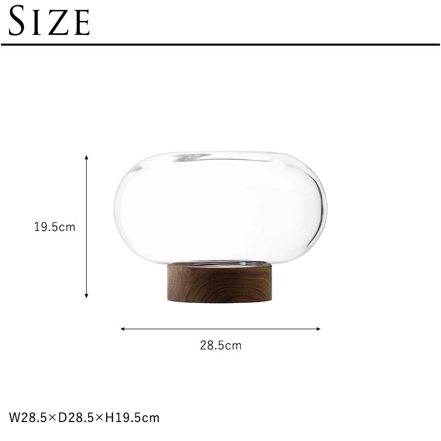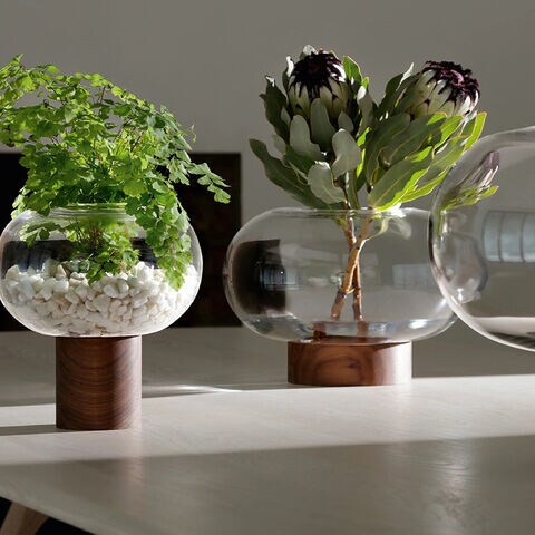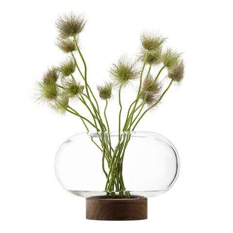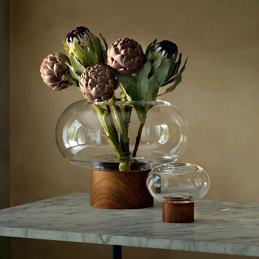 ウォールナット材のベースに据えられた、横広がりのボール型花器。すっきりとしたフォルムの吹きガラスとブラックウォールナット材の有機的な杢目がコントラストを織りなします。