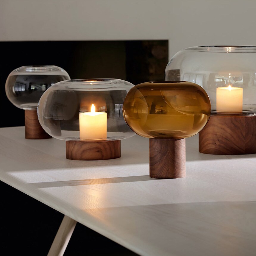 すっきりとしたフォルムの吹きガラスとブラックウォールナット材の有機的な杢目がコントラストを織りなします。