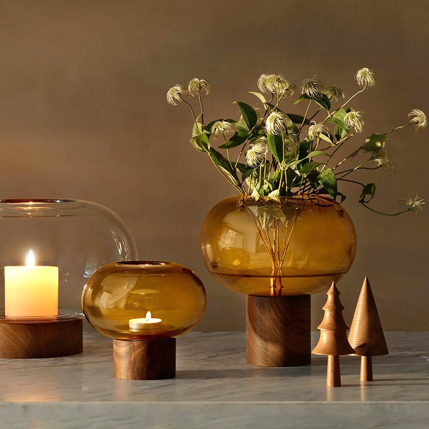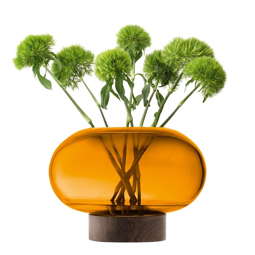 ウォールナット材のベースに据えられた、横広がりのボール型花器。すっきりとしたフォルムの吹きガラスとブラックウォールナット材の有機的な杢目がコントラストを織りなします。