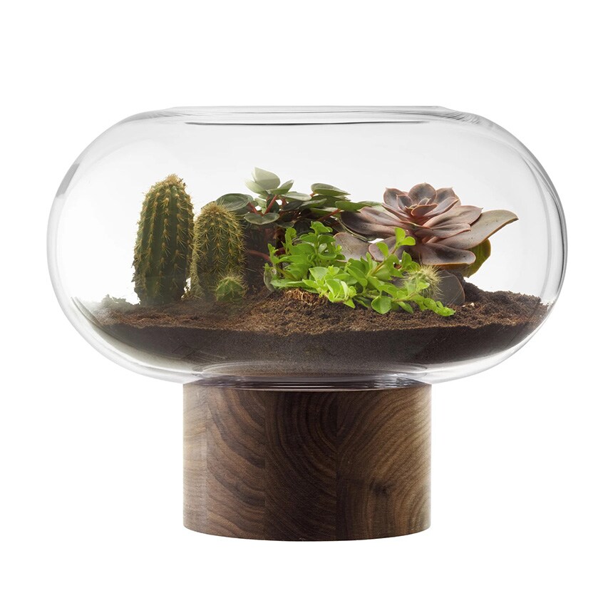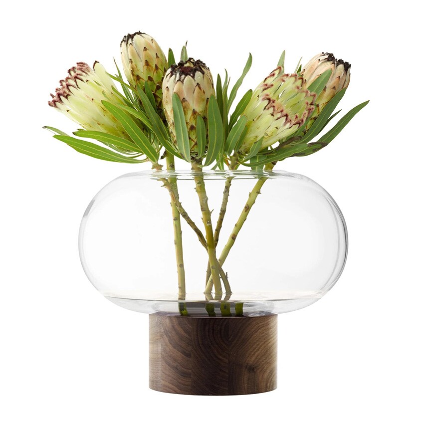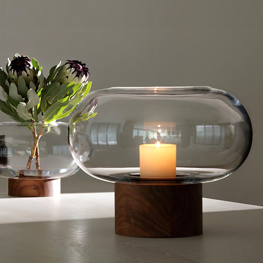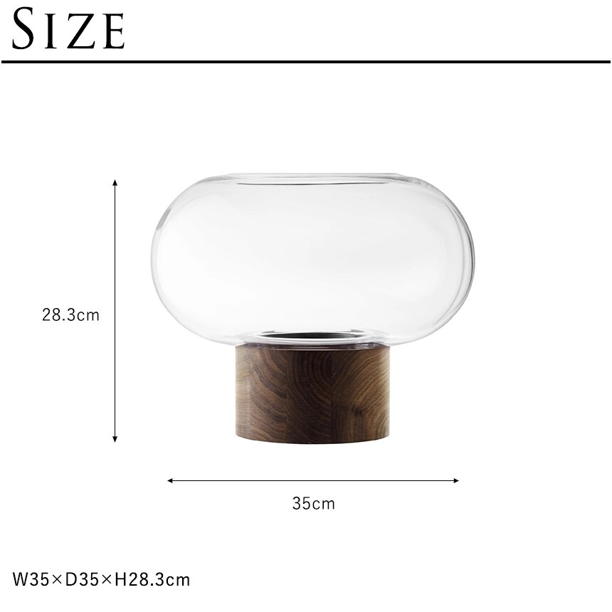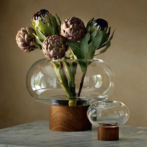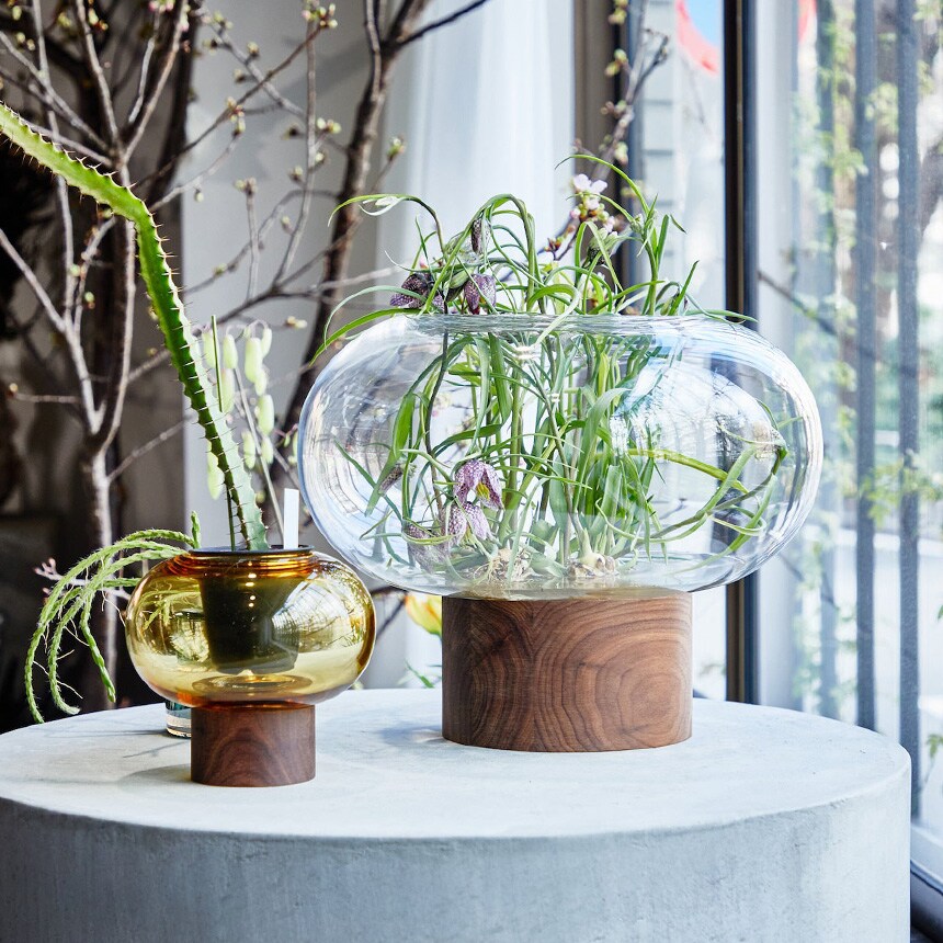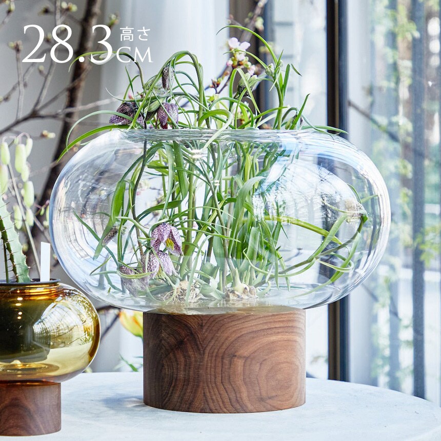 ウォールナット材のベースに据えられた、横広がりのボール型花器。すっきりとしたフォルムの吹きガラスとブラックウォールナット材の有機的な杢目がコントラストを織りなします。