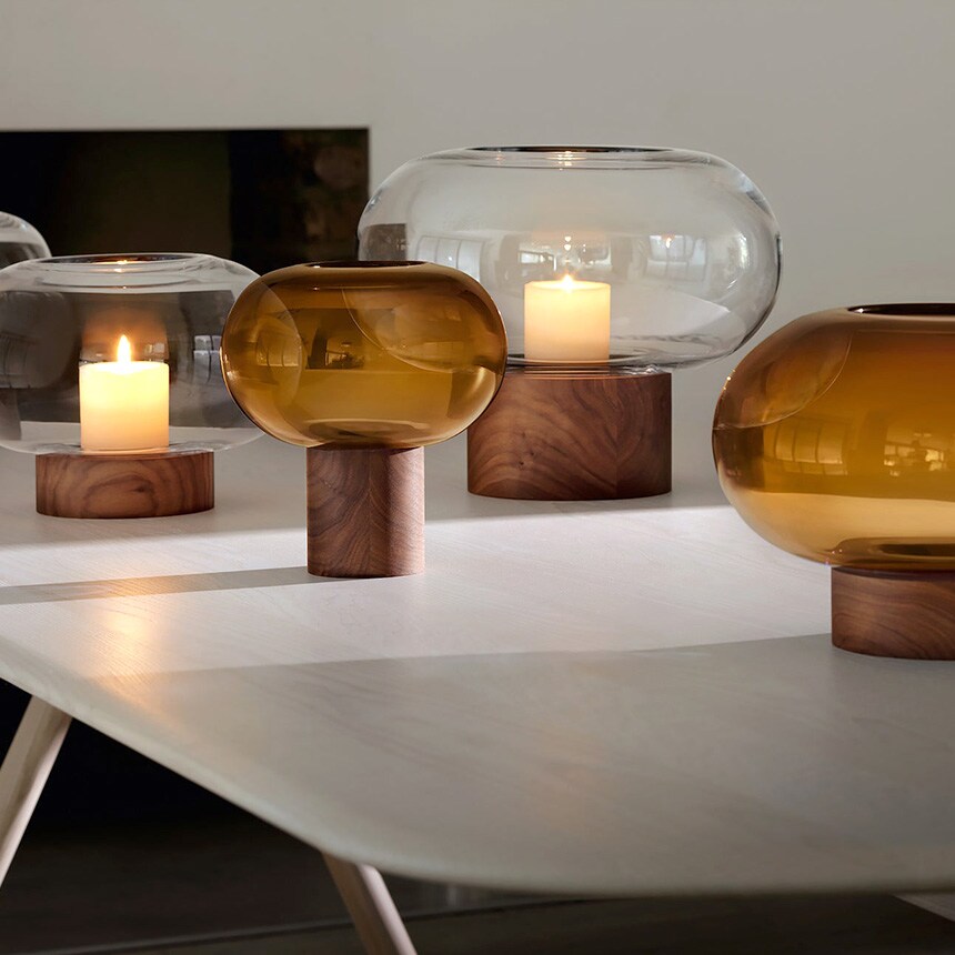 すっきりとしたフォルムの吹きガラスとブラックウォールナット材の有機的な杢目がコントラストを織りなします。