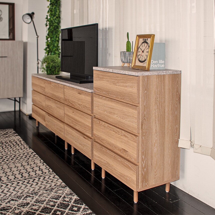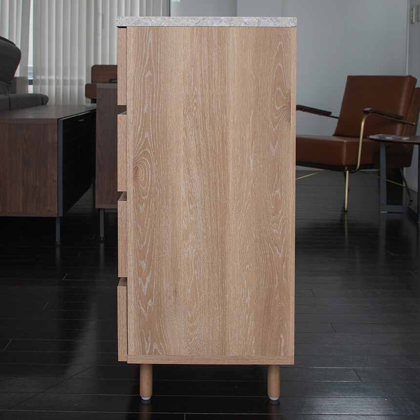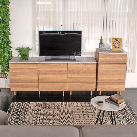 石目調タイルの天板のコントラストが格調高いインテリアの雰囲気を作り出すおしゃれなチェスト。