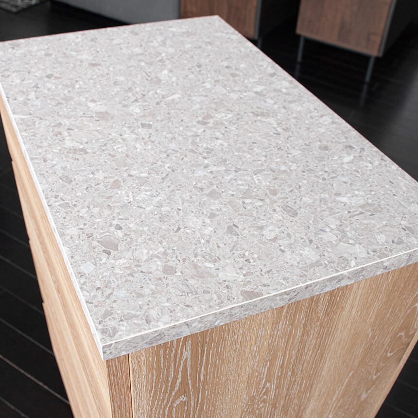 インテリアが引き締まる石目調の天板 天板は石目調のデザインのメラミン天板を仕様。