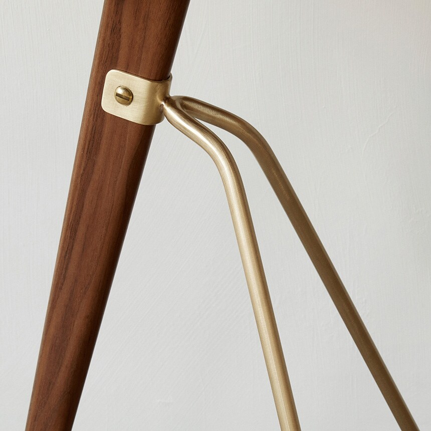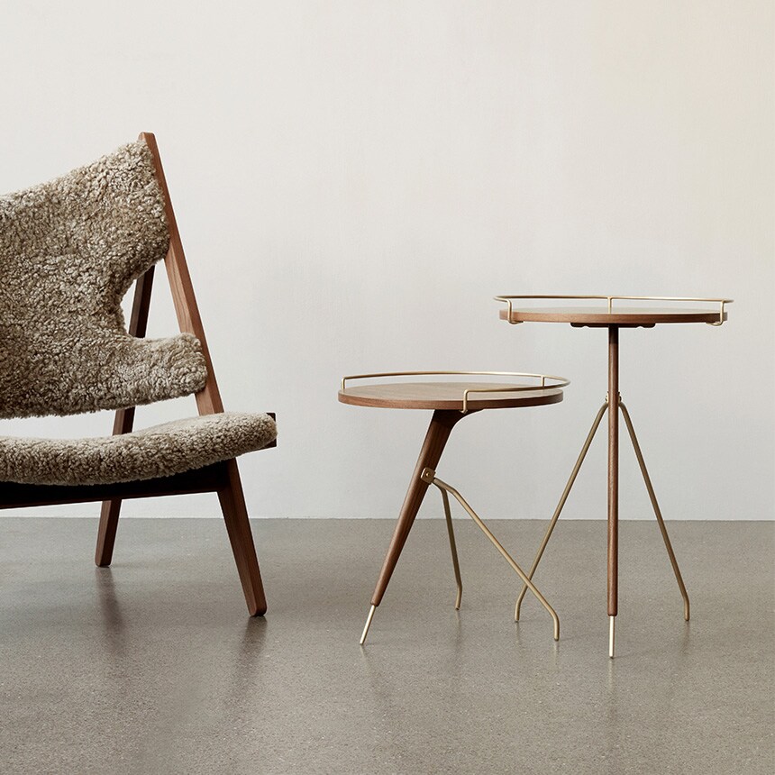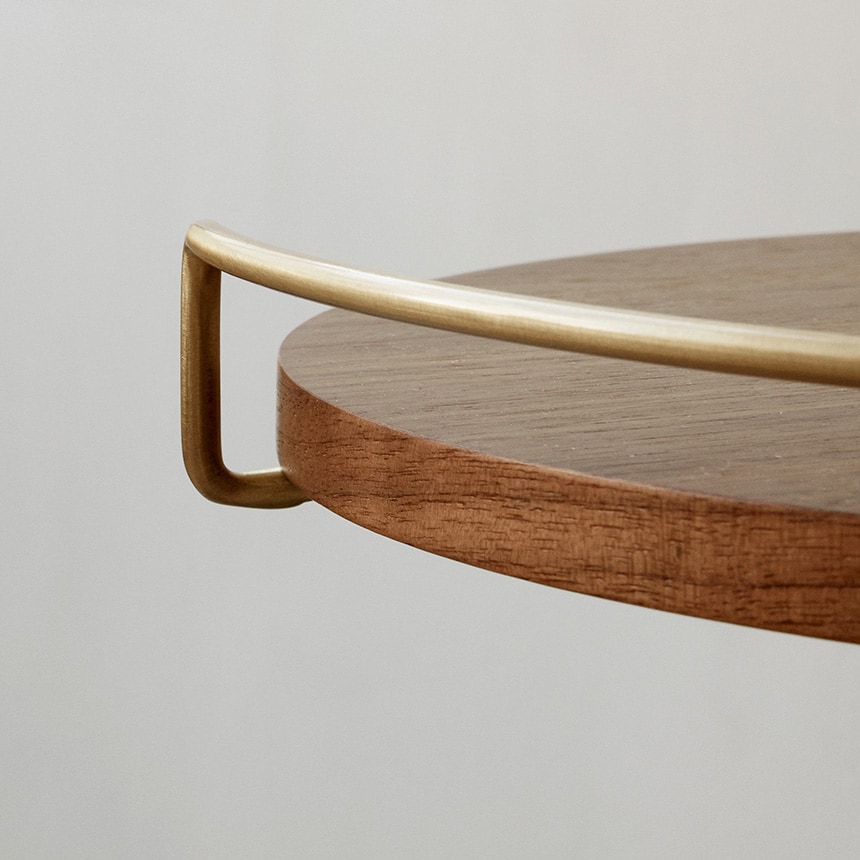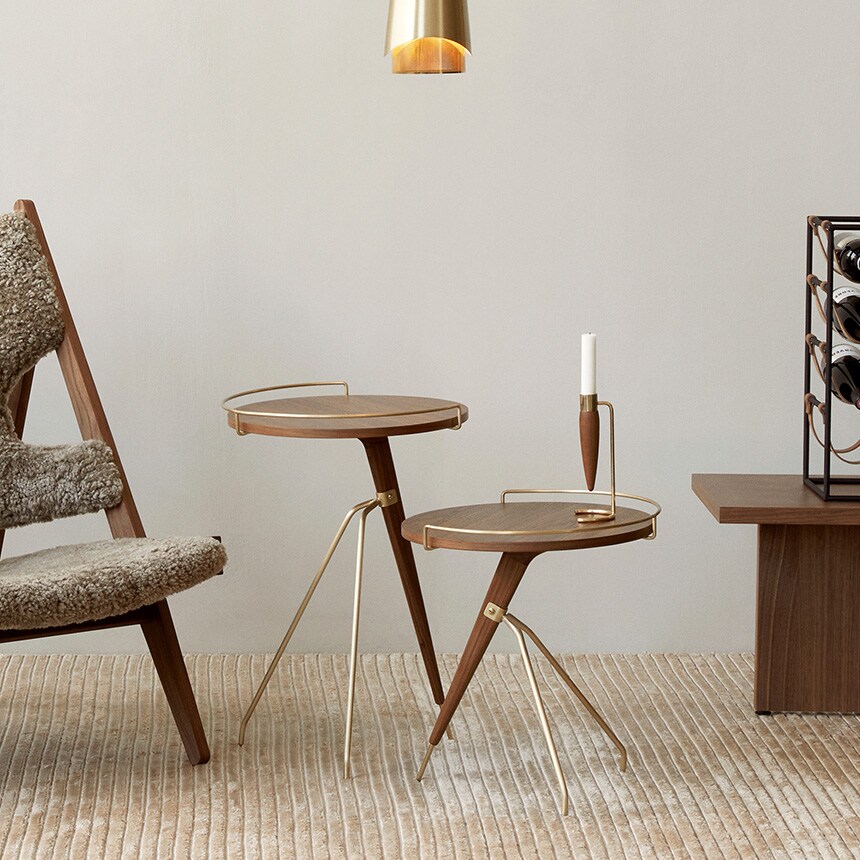ウォルナットと真鍮の美しい素材のバランスが際立つこのテーブルは、丸みを帯びた天板と三脚風のフレームが特徴的で、