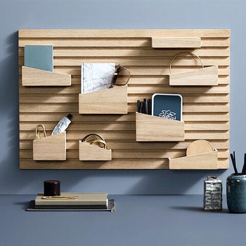 「インプット オーガナイザー」は、サイズや形状が異なる8つの可動式ポケットを備えた壁掛け収納です。