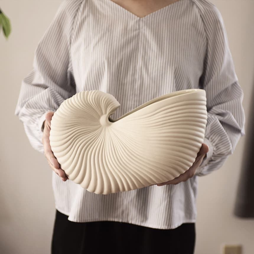 オウム貝を思わせる独特な形状で、インテリアとしても使えるフラワーベースや植木鉢として機能します。