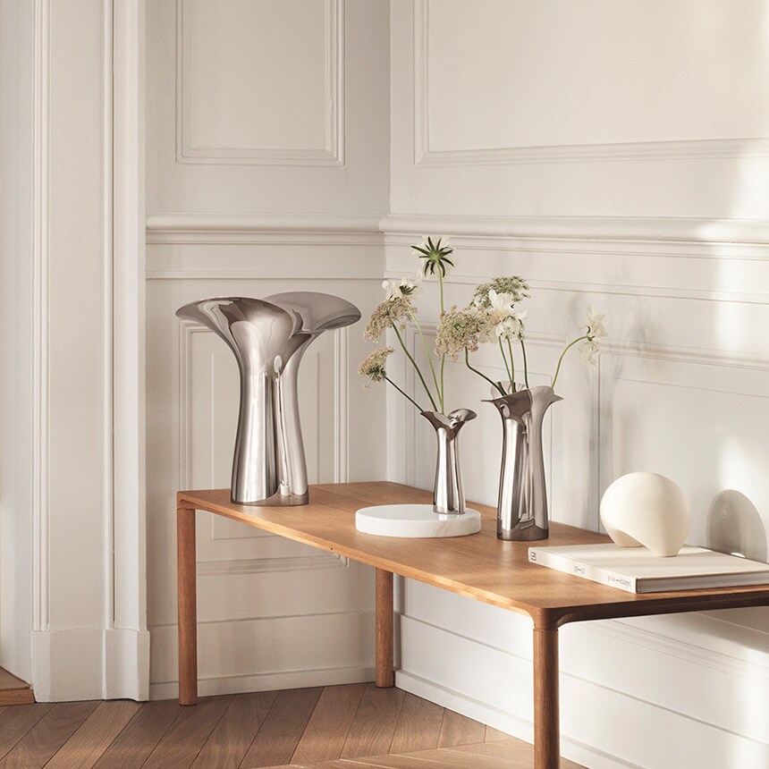 備考:花のつぼみがほころび、花びらが姿を見せる瞬間にインスピレーションを得て誕生したブルーム ボタニカ(Bloom Botanica)コレクション。 彫刻的な美しさを放つ花瓶はテーブルや窓辺を彩ります。 デンマーク出身のデザイナーのヘレ・ダンケア手作業で原型を作ることで、ステンレススティールなどの人工的な素材にも有機的な温かみや触感を感じさせる作品を生み出します。 彼女が手がけたブルーム(Bloom)コレクションは長年の人気シリーズです。 ブルーム ボタニカ(Bloom Botanica)ヴェースはミラー仕上げのステンレスを使用しています。完璧な自然なフォルムの喜びが溢れるようなプロダクト。 ミラー仕上げのステンレスの硬質感とゆるやかなフォルムが美しく調和し、インテリアに華やかさを添えてくれます。