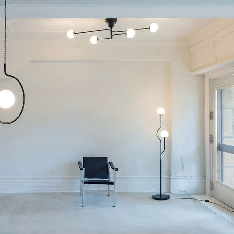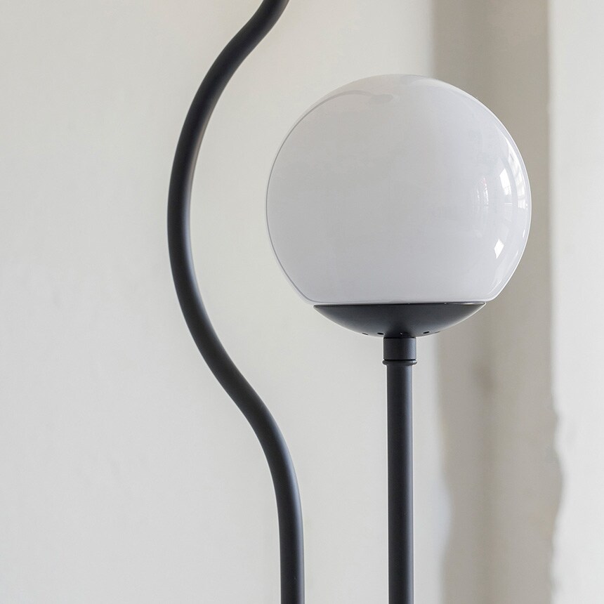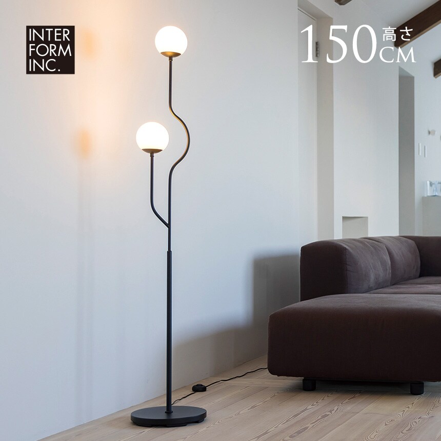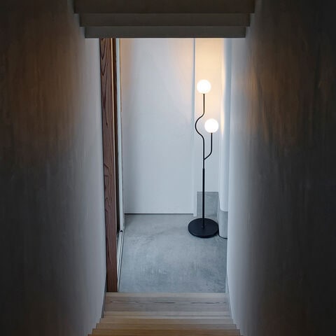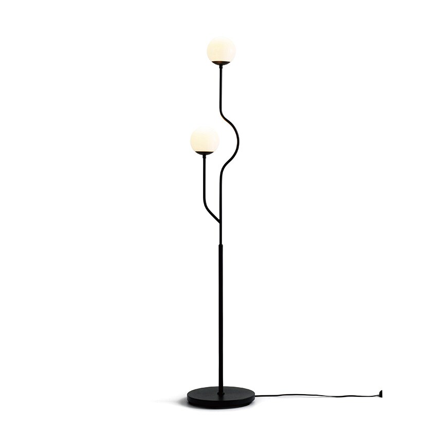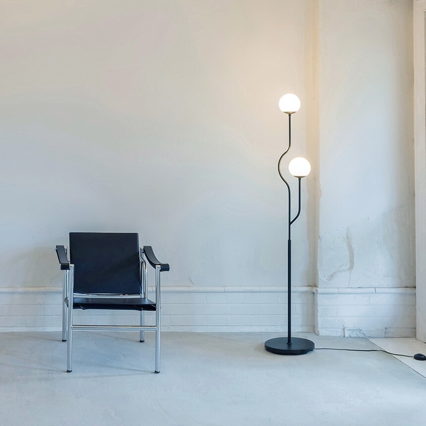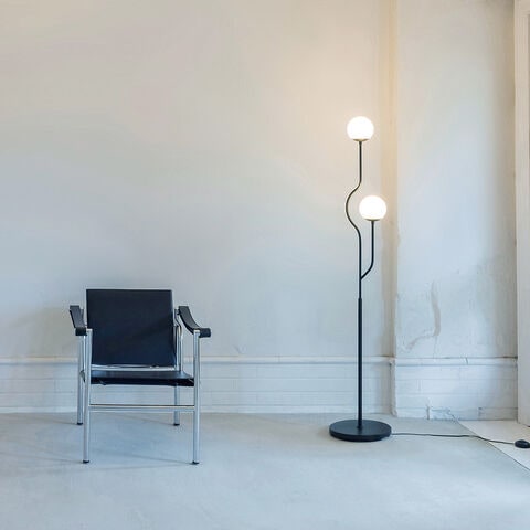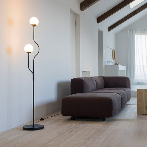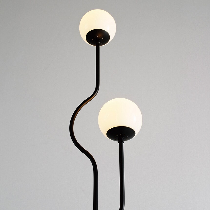 幾何学的に枝分かれした支柱と、光源を迂回するような大胆なラインが特徴の2灯タイプのフロアライト。