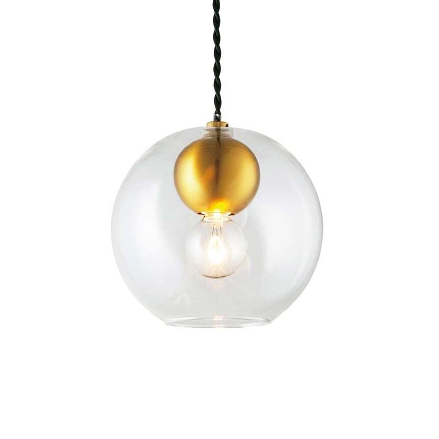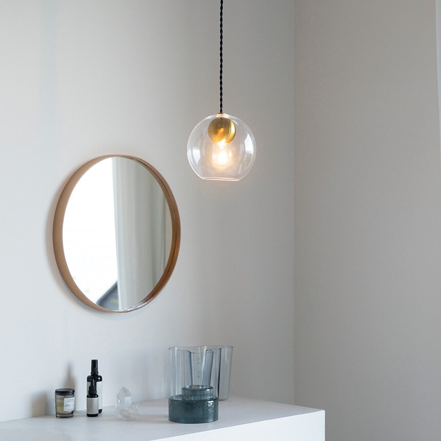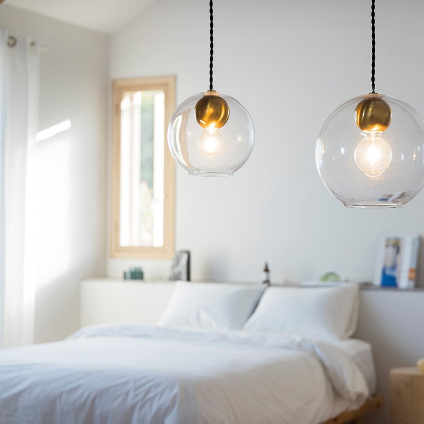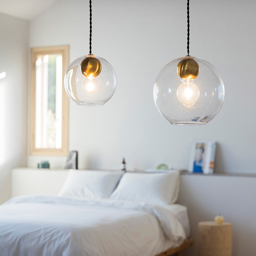 クリアガラス、ゴールドのソケット、電球の3つの球体が織りなすデザインは、柔らかく優しい印象を与えます。