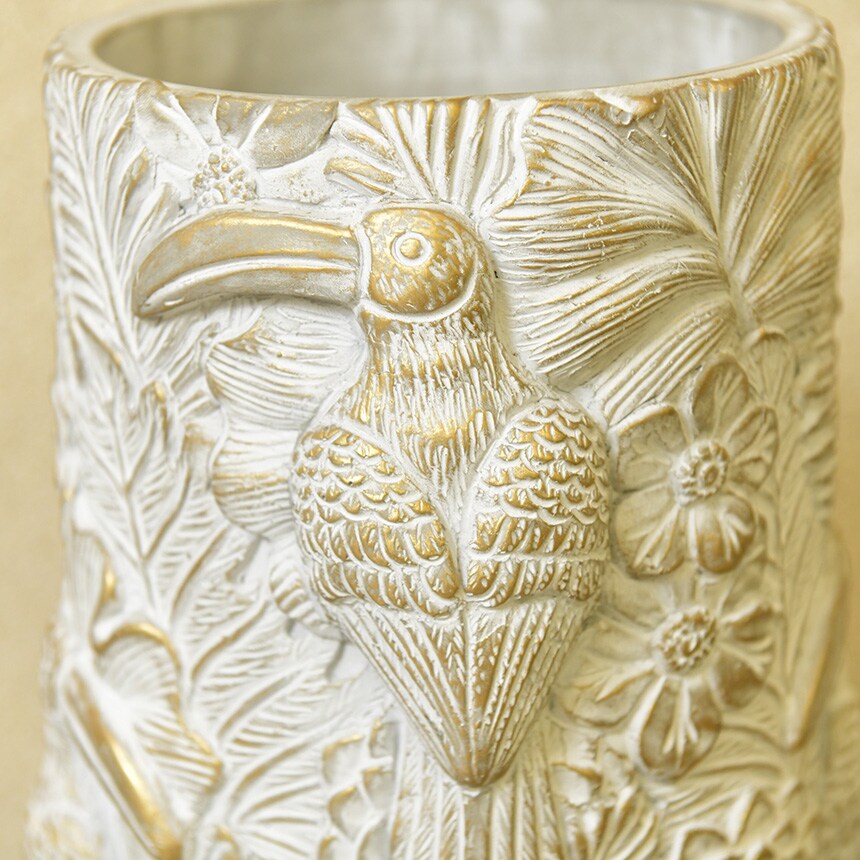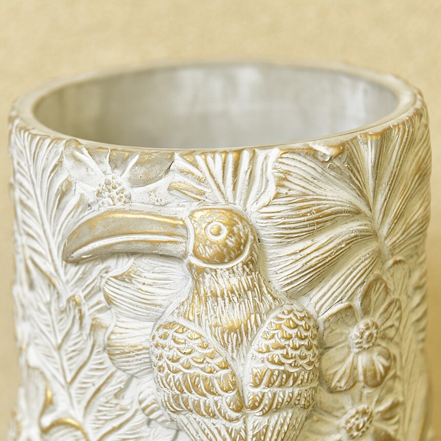 立体的なトゥーカン(オオハシ)のデザインがおしゃれ。花や植物も立体的で豪華なイメージ。