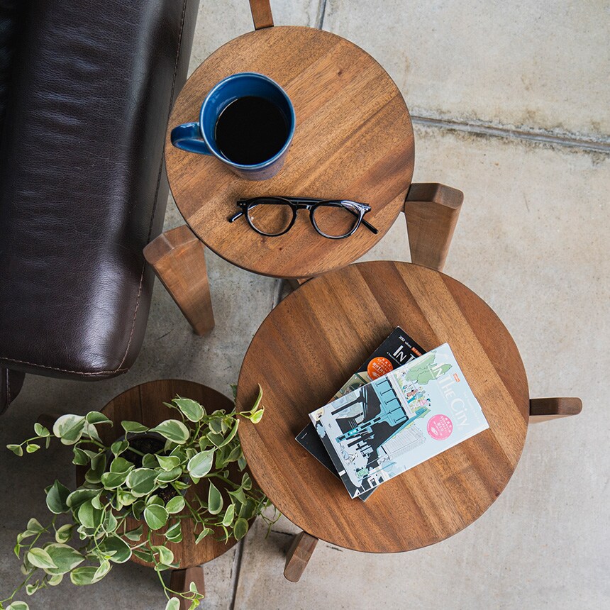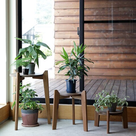 異なる脚の高さを活かして、グリーンや小物を立体的に飾ることができ、空間にリズムと奥行きを与えます。