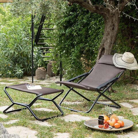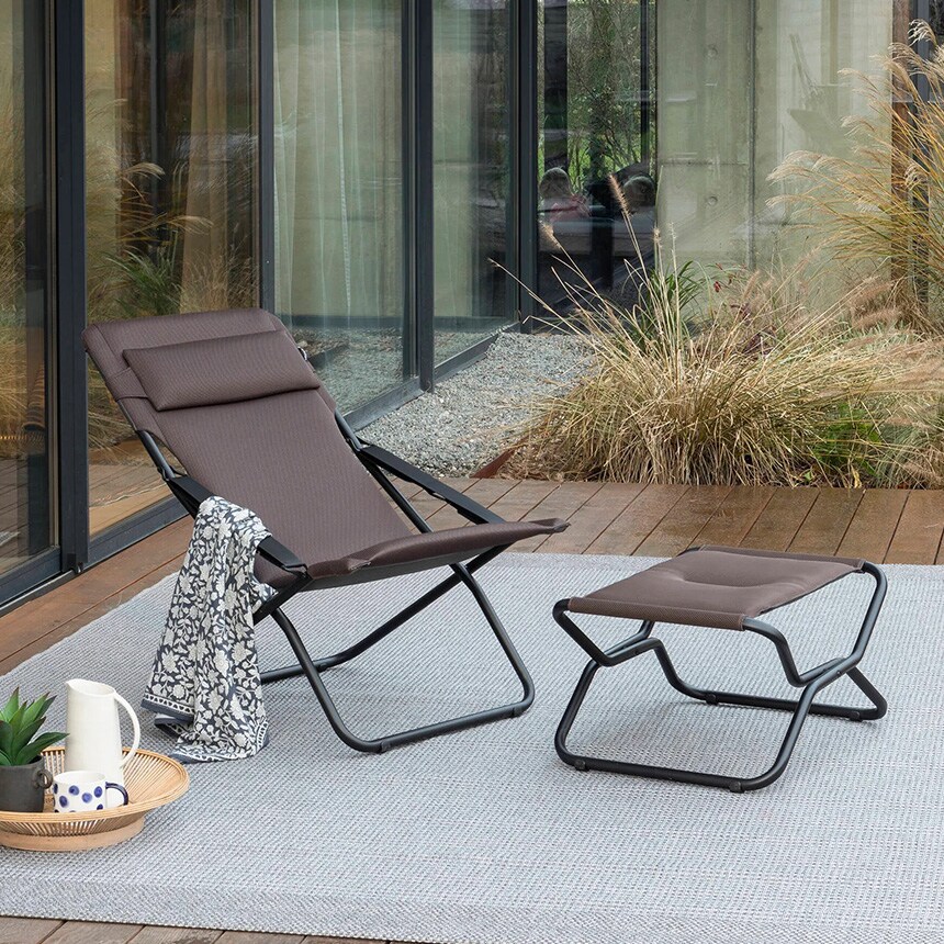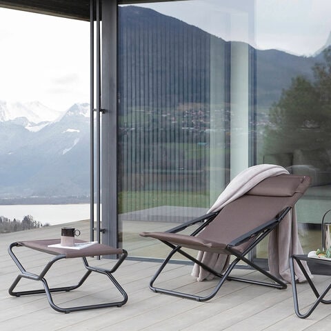 別売りの「NEXT」オットマンと合わせることで、足までしっかり伸ばせる本格的なサンラウンジャーに。