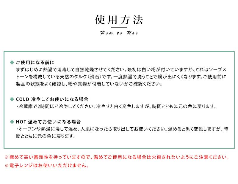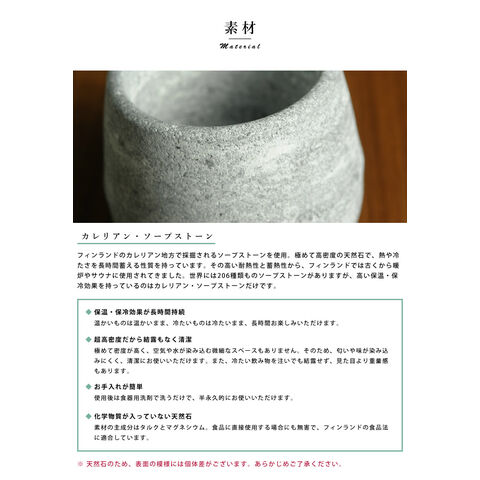 その特性として高い保温性と保冷性の両方を持つ為温度を長時間保つことができる。