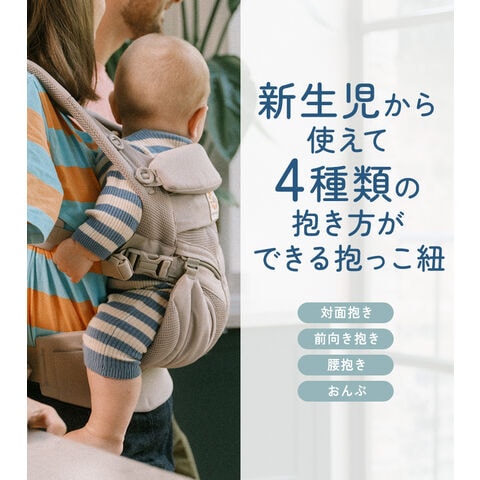 乗せ降ろしが増える1~3歳頃のお出かけにはヒップシートが大活躍。 ・対面抱き、前向き抱き、腰だき、授乳補助の4通りの使い方が可能で、シーンに合わせて柔軟に対応できます。 ・サッと装着できるウエストベルトバックルを留めるだけのシンプルな設計。