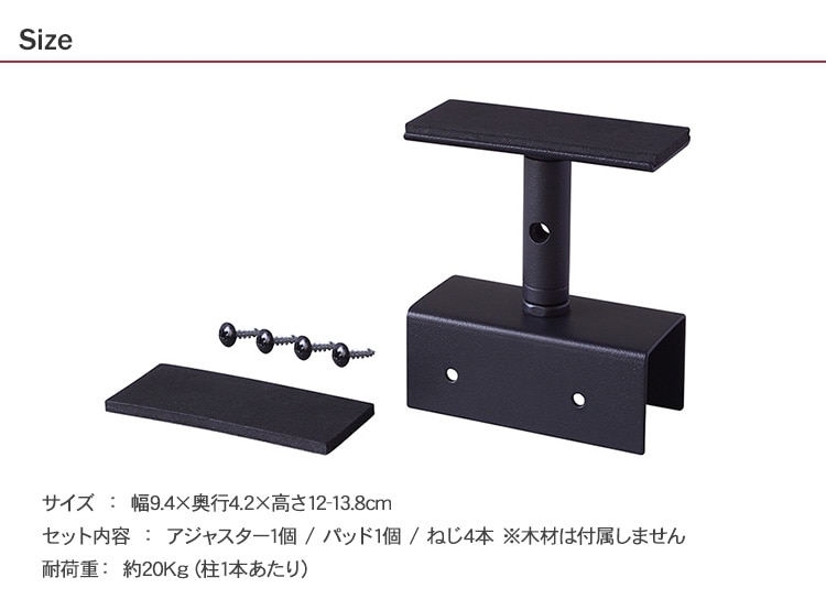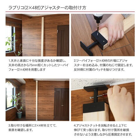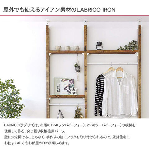商品説明:LABRICO(ラブリコ)は、市販の1×4(ワンバイーフォー)、2×4(ツーバイーフォー)の板材を使用して作る、突っ張り収納柱用パーツ。