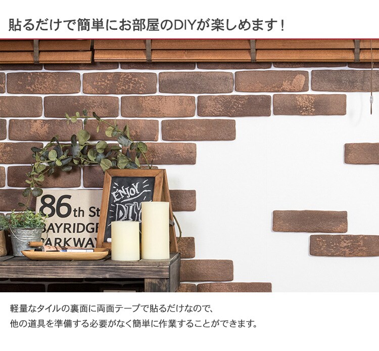 安心の日本製!軽量なタイルの裏面に両面テープで貼るだけでレンガのようなおしゃれな壁がDIYできます。