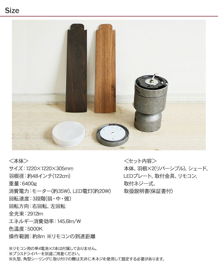 セット内容:本体、羽根×2、シェード、LEDプレート、取付金具、リモコン、取付ネジ一式、取扱説明書(保証書付)