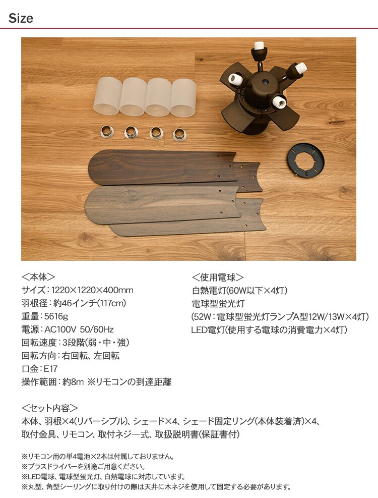 セット内容:本体、羽根×4、シェード×4、シェード固定リング×4、取付金具、リモコン、取付ネジ一式、取扱説明書(保証書付)