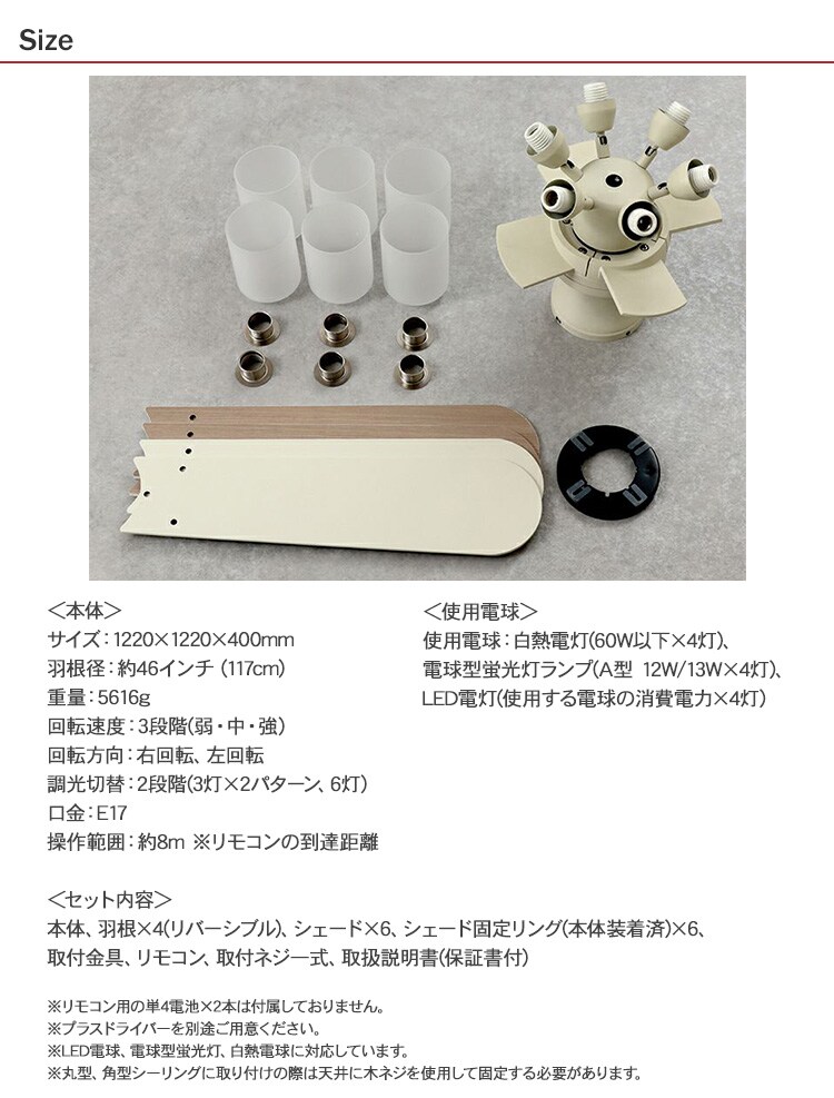 セット内容:本体、羽根×4、シェード×4、シェード固定リング×4、取付金具、リモコン、取付ネジ一式、取扱説明書(保証書付)