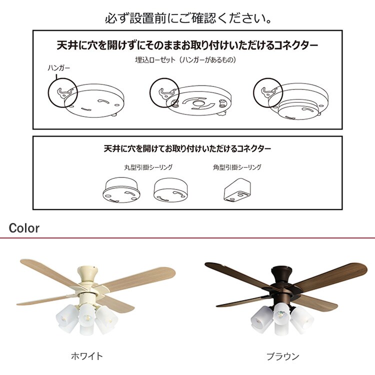 ※丸型、角型シーリングに取り付けの際は天井に木ネジを使用して固定する必要があります。
