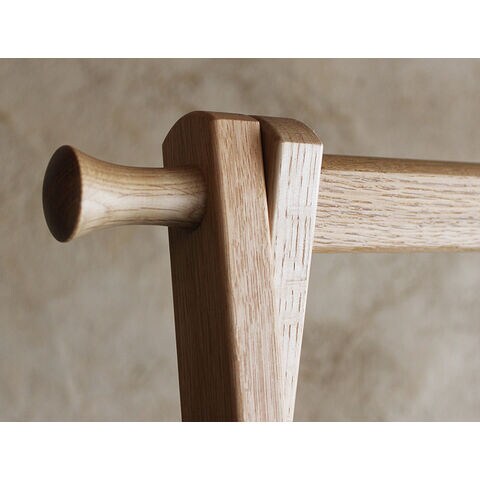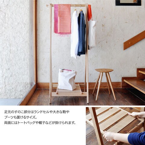 商品説明:洋服やコート、鞄やストールなどを一箇所にまとめて収納することができる、コンパクトでシンプルなデザインのハンガーラック。