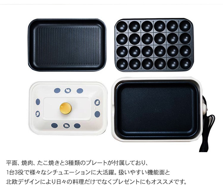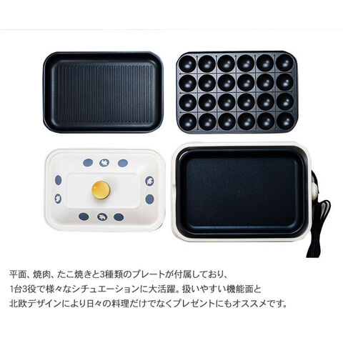 平面、焼肉、たこ焼きと3種類のプレートが付属しており、1台3役で様々なシチュエーションに大活躍。